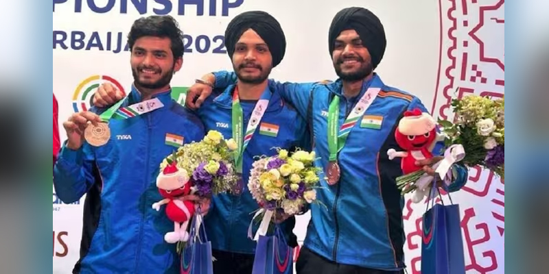 1,734 புள்ளிகளுடன் அர்ஜூன் சீமா, சரப்ஜோத் சிங், ஷிவா நர்வா ஆகியோர் அடங்கிய இந்திய அணி தங்கம் வென்று சாதனை படைத்துள்ளது.